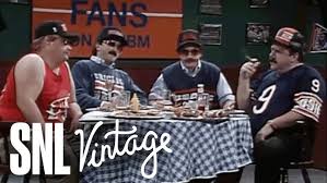The Super fans on SNL were fans of the Chicago Bears and Mike Ditka. I imagine George Wendt grew up a Bears fan in Chicago. The skit had these guys sitting at a table drinking beer, eating food, and bragging about Da Coach who was Ditka at the time. They always predicted Da Bears would trounce whatever team. It was a talented cast of actors starting with Joe Mantegna playing Bill Swerski, Chris Farley playing Todd O’Connor, Mike Myers playing Pat Arnold, while Robert Smigel played Carl Wollarski. They all did these skits in a Chicago accent as well.